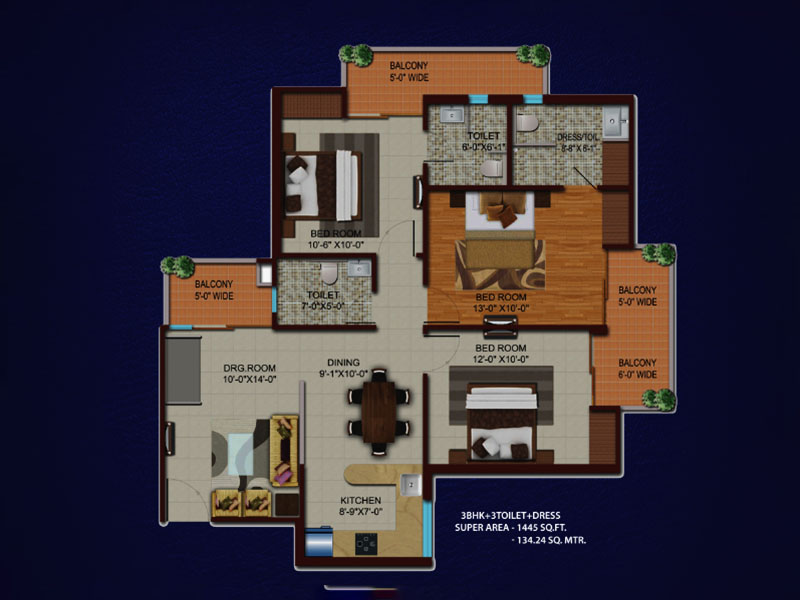 | 3 BHK | 1445 Sq Ft | 62.66 Lac | View Floor Plans | View Details |
